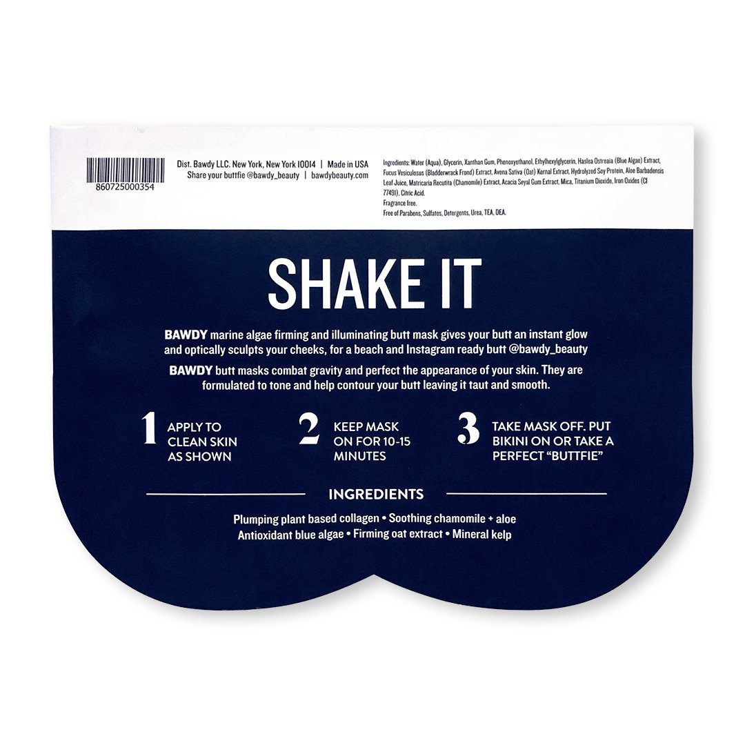 Shake It - Firming + Illuminating Marine Algae Butt Mask: helps combat gravity and perfect the appearance of your skin. It is formulated to tone and help contour your butt, leaving it taut and smooth. This natural sheet mask gives your butt a glow and sculpts your cheeks.