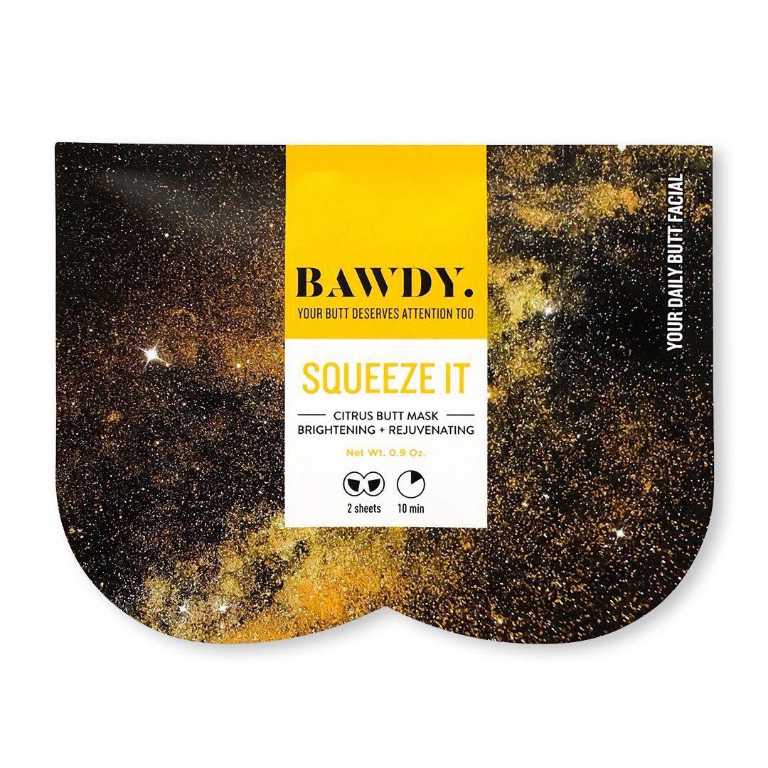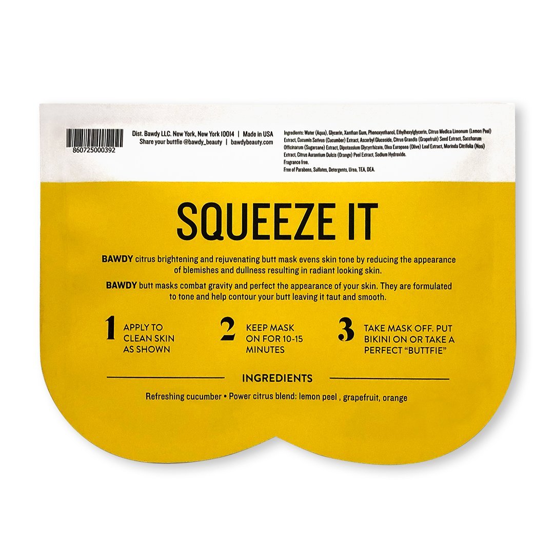 Squeeze It - Brightening + Rejuvenating Citrus Butt Mask: helps combat gravity and perfect the appearance of your skin. It is formulated to tone and help contour your butt leaving it taut and smooth. This natural sheet mask helps to even skin tone by working to reduce the appearance of blemishes and dullness, to help achieve radiant looking skin.